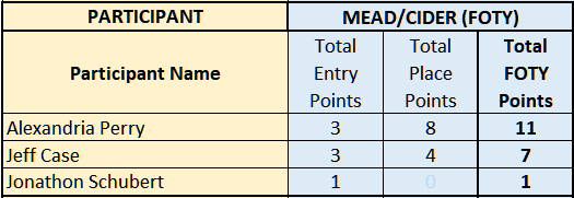 The title of QUAFF Fermentationst of the Year is awarded annually to the club member who accumulates the most total points for mead/cider entries in QUAFF Club Only Competitions. Each eligible mead/cider entry earns 1 entry point for each participating brewer. The top 3 overall entries from each COC earn additional points as follows: