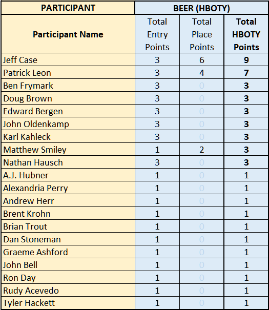 The title of QUAFF Homebrewer of the Year is awarded annually to the club member who accumulates the most total points for beer entries in QUAFF Club Only Competitions. Each eligible beer entry earns 1 entry point for each participating brewer. The top 3 overall entries from each COC earn additional points as follows: